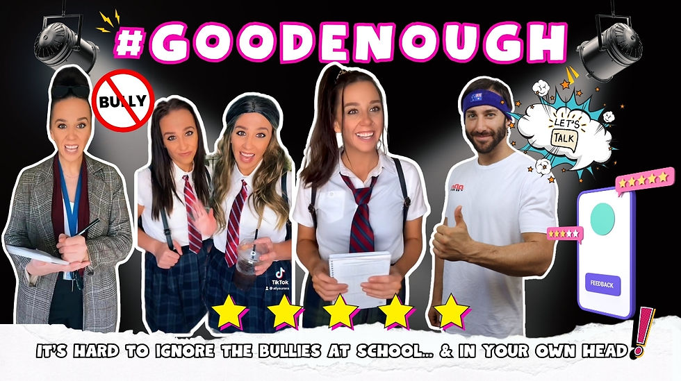 GoodEnough focuses young minds on their ability to use positive self-talk by breaking our thoughts up into the characters of our 'Inner Critic' & 'Inner Encourager'.This show is interactive, allowing students to join in and become the characters as it is played out! GoodEnough plays out relatable student scenarios and hits some truths about negative self-talk, relating to the pressures students face, at home, at school, from their peers and in their own MIND. Students are given the tools needed for them to gain control over their own positive or negative thinking. They feel empowered with their self-awareness increased. GoodEnough hits some emotional truths and exposes the 'put downs' we can all say to ourselves. It touches on our own thoughts of body image, peer pressure, binge drinking and not feeling good enough.The show is followed by a workshop where students are given the opportunity to discover their own 'Inner Critic' and 'Inner Encourager'. They are left feeling empowered, knowing that it is their choice to have their thoughts work for them or against them.